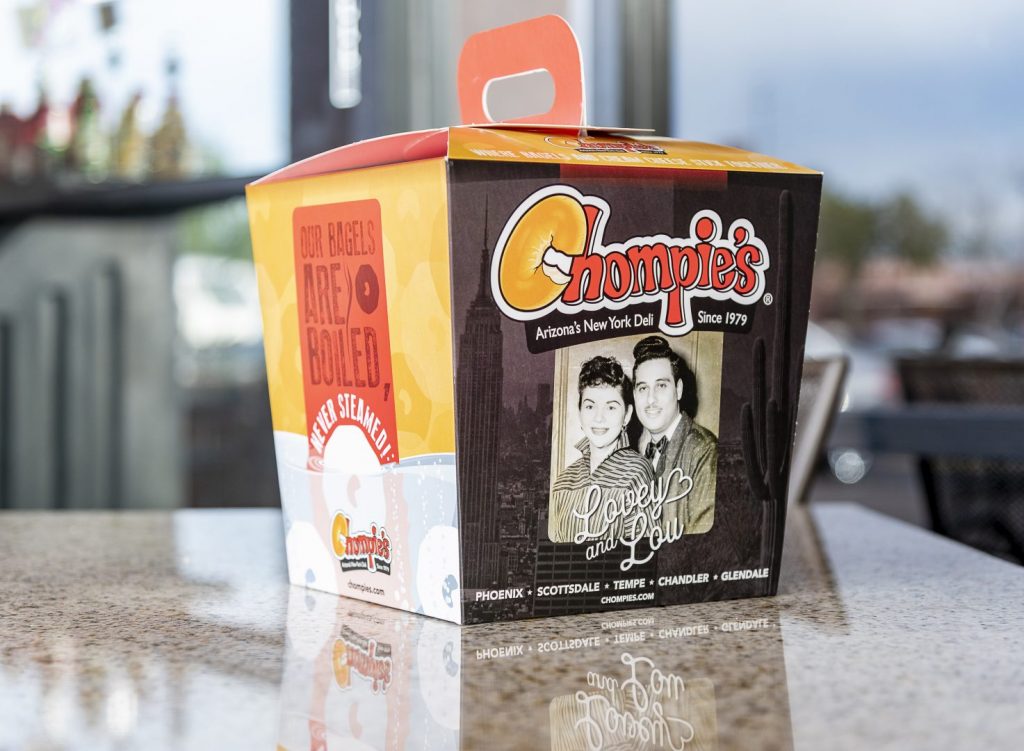 On Wednesday, February 13, stop by any of Chompie’s five Valley locations and save 40% off a Bagel Box (thirteen signature, boiled bagels and two half-pound containers of cream cheese.)